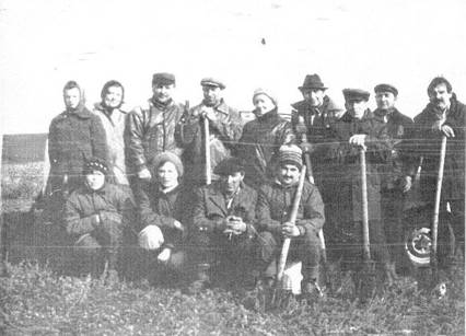 Naturfreunde beim Bäumepflanzen am Nordufer des Tocks, auf den sogenannten Baschkirischen Bergen. Johann Dück vorne 2-er von rechts, Helene Jung (geb. Walde) vorne 3te von rechts. 1980er