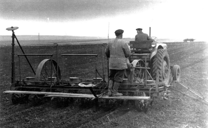 Rübensämaschine von einem Traktor MTS-5 angetrieben.