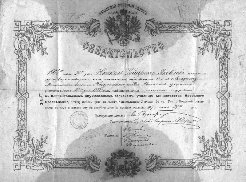 Urkunde des Absolventen der Köppentaler Lehrerschule Heinrich Nickel (Ischalka, Dolinsk).