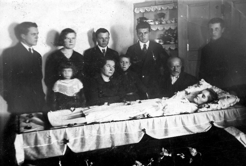 Johann Walde 3.v.rechts mit den Eltern und Geschwistern am Sarge seiner Frau Katharina geb. Neufeld.