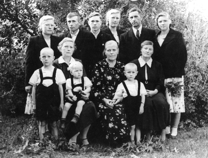 Familie Hein v.l.n.r.: hinten – Irma Hein, Jakob Stobbe, Waldemar Stobbe, Maria Hein (Fröse), Johann Hein, Hermine Hein (Sawadski), vorne – Jakob Stobbe, Katharina Stobbe, geb. Hein, Peter Stobbe, Justina Hein Mutter, Johann Stobbe, Katharina Hein (die Frau von Johann).
