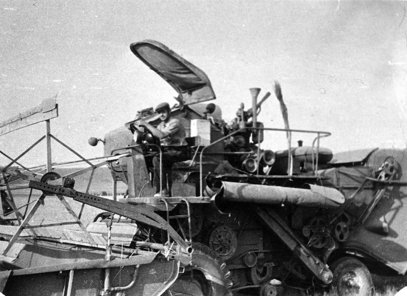 Peter Funk in der Erntezeit auf einem Mähdrescher SK-4 während des Studiumspraktikums auf dem Neuland in den Ostorenburger Ursteppen.